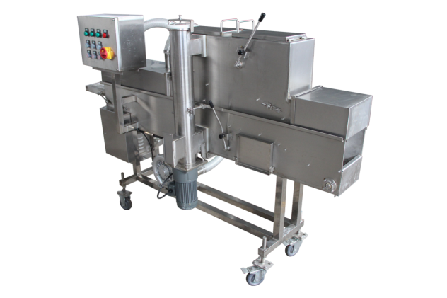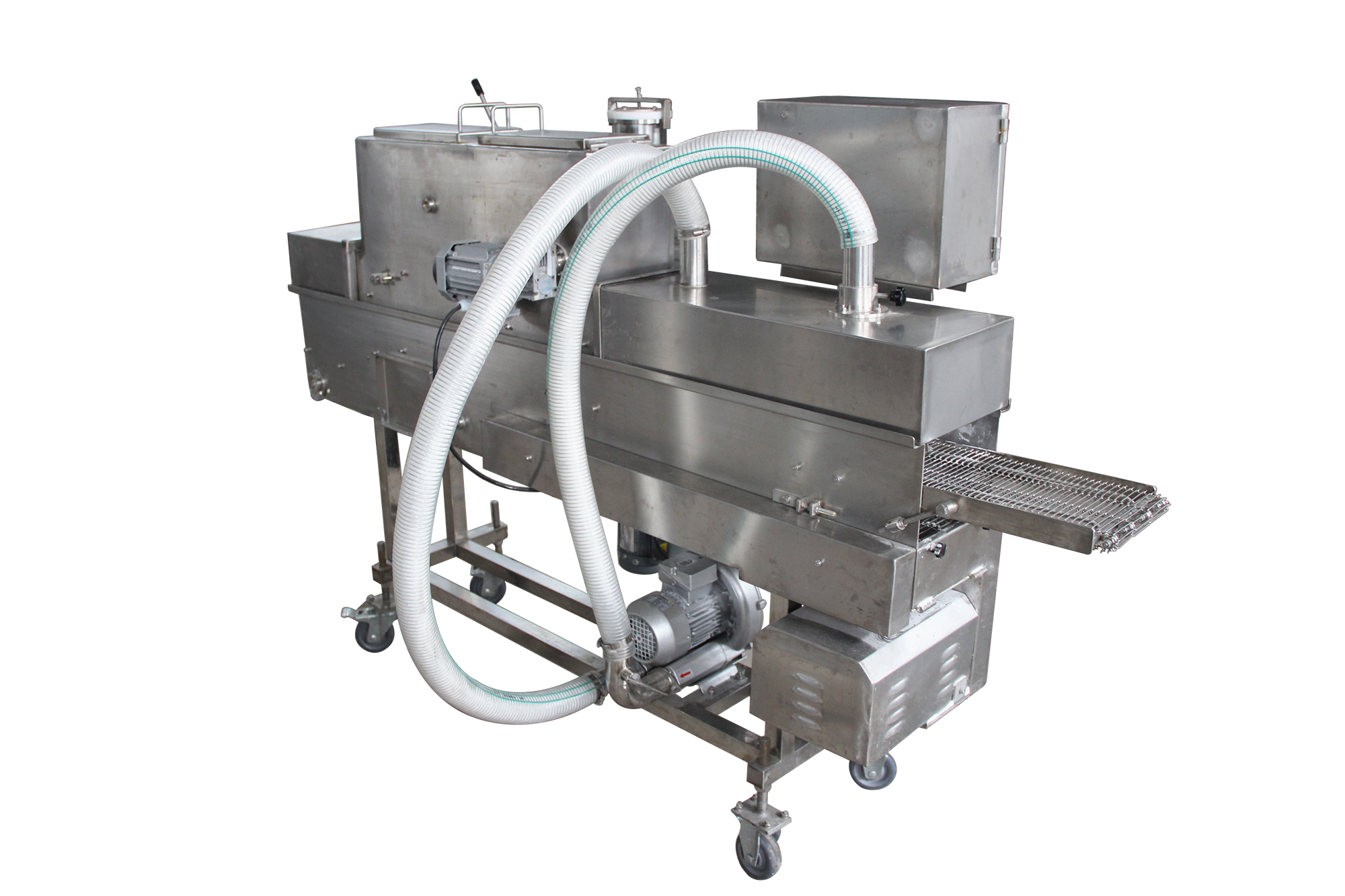 裹粉機能自動完成產(chǎn)品的上粉過程,適用于各種預上粉、混合粉等。產(chǎn)品進入下網(wǎng)帶,底部及側(cè)面沾滿粉,從上料斗流下的粉將產(chǎn)品上部覆蓋,經(jīng)壓輥壓緊(上下網(wǎng)帶上的粉厚度可以方便調(diào)節(jié)),上粉后經(jīng)過風管,將多余的粉吹落。進入下一道程序。