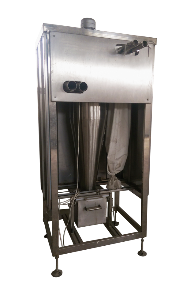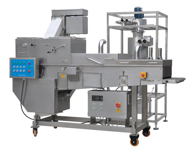 裹粉機(jī)能自動(dòng)完成產(chǎn)品的上粉過(guò)程,適用于各種預(yù)上粉、混合粉等。產(chǎn)品進(jìn)入下網(wǎng)帶,底部及側(cè)面沾滿粉,從上料斗流下的粉將產(chǎn)品上部覆蓋,經(jīng)壓輥壓緊(上下網(wǎng)帶上的粉厚度可以方便調(diào)節(jié)),上粉后經(jīng)過(guò)風(fēng)管,將多余的粉吹落。進(jìn)入下一道程序。產(chǎn)品通過(guò)傳送網(wǎng)帶時(shí)被均勻的裹涂上一層混合粉,以適應(yīng)下道工序的要求,可以同上漿機(jī)、上面包屑機(jī)連接,組成不同產(chǎn)品的生產(chǎn)線。從而完成粉、漿、粉,漿、粉及漿、粉、粉工藝。