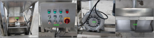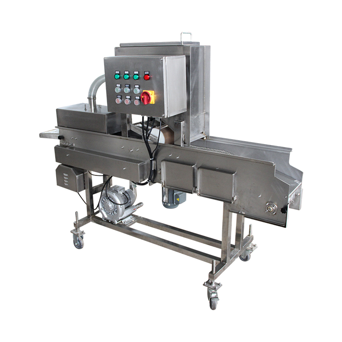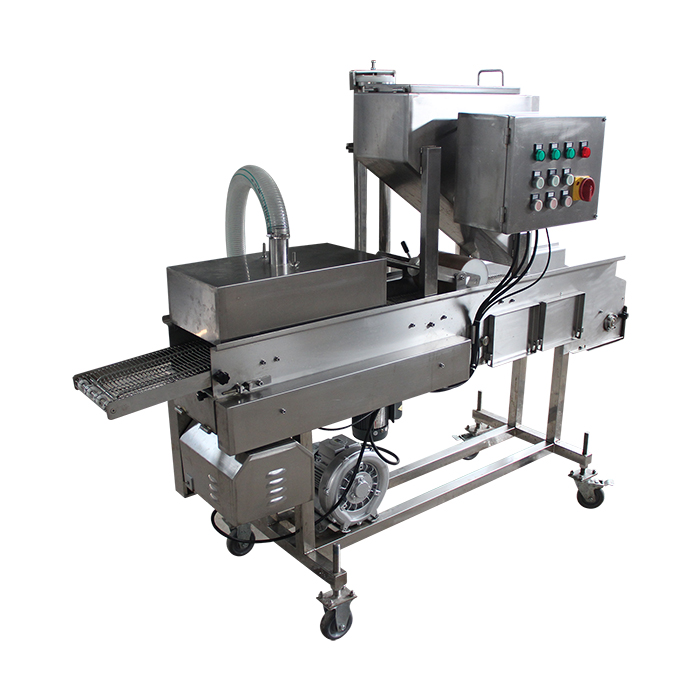 裹漿后產(chǎn)品進(jìn)入下網(wǎng)帶,底部及側(cè)面沾滿面包屑,從上料斗流下的面包屑將產(chǎn)品上部覆蓋,經(jīng)壓輥壓緊(上下網(wǎng)帶上的面包屑厚度可以方便調(diào)節(jié)),上康后經(jīng)風(fēng)機(jī),將多余的面包屑吹落。進(jìn)入下一道程序。