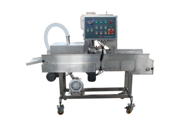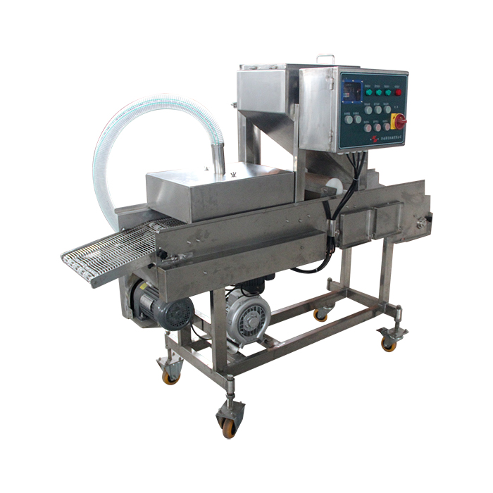 上屑機與上漿機配合使用,裹面包屑機可單獨使用。上面包屑機適合于中等以上干面包糠顆粒,全自動裹康機對市場上流行的漢堡肉餅、麥樂雞塊、魚香漢堡肉餅、土豆餅、南瓜餅、肉串等產(chǎn)品進行上面包屑處理,是快餐店、配送中心、食品工廠理想的上面包屑設備。