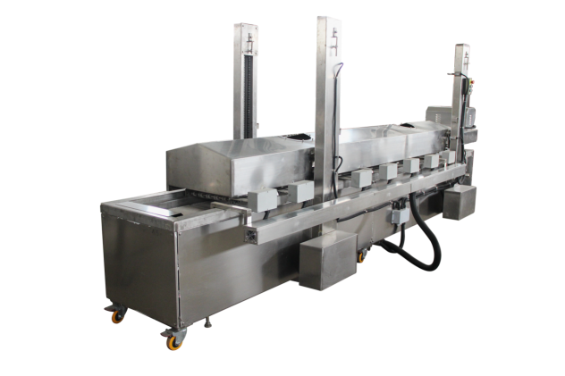 電油炸機(jī)是連續(xù)炸物機(jī),食品從機(jī)體的進(jìn)口端輸入后,隨輸送帶在熱油中通過時被油炸熟化,并從機(jī)體的出口端輸出。